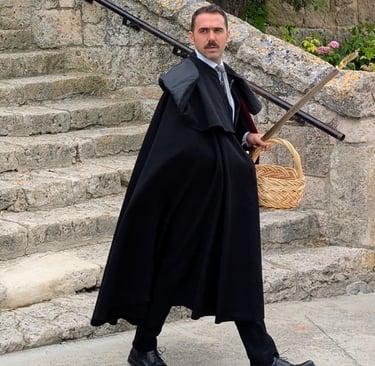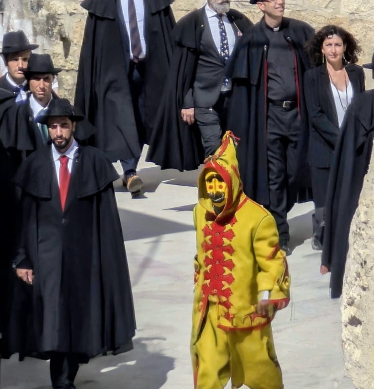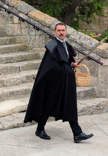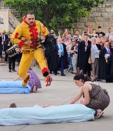 The Brotherhood leads the way. El Colacho follows, wearing a bright yellow suit with tassels and red zigzag stripes. His grotesque mask, the birria, features dark eyes, a large nose, and a twisted chin. He beats his tarañuelas and waves his zurriago, storming through the streets and stirring up chaos. At his side, the Atabalero keeps time on his atabal drum, announcing the presence of the Blessed Sacrament with every beat.