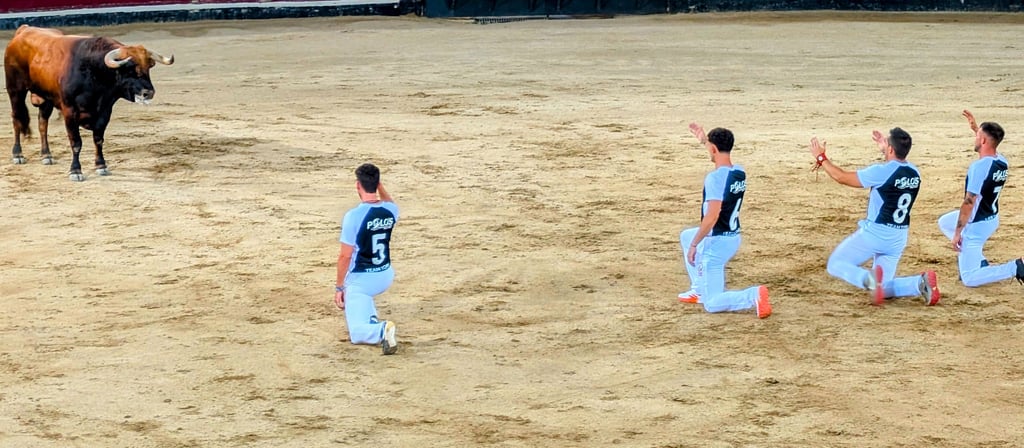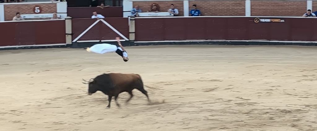 Los recortadores salieron pavoneándose como un equipo infantil de ligas menores, con uniformes, niños y todo. Se persignaron en la arena, luego se apartaron cuando los toros irrumpieron. Lo que siguió fue mitad circo, mitad espectáculo suicida, con quiebros, giros y saltos sobre cuernos lo bastante afilados como para ensartarlos. Los toros eran impresionantes, a la vez juguetones y cabreados, pero todos acabaron reventados. Jadeando, con el cuerpo hundido, y uno que directamente se negó a salir hasta que entraron vacas enormes a escoltarlo. Cuando bajó el polvo, los recortadores se arrodillaron para saludar a los mismos animales a los que acababan de torear sin capa durante veinte minutos.